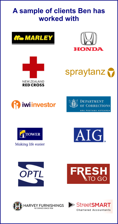 Clients include senior executives at large organisations such as Marley, Red Cross, AIG and Honda…managing directors, boards and team members of multi-million dollar a year privately owned companies, government department leaders, and the owners of small businesses.