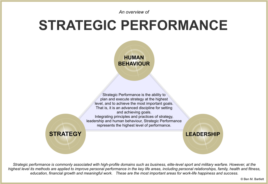 Strategic performance is commonly associated with high-profile domains like business, elite-level sport and military warfare. However, at the highest level its methods are applied to improve personal performance in the key life areas, such as personal relationships, family, health and fitness, financial growth, education and meaningful work. These are the most important areas for work-life happiness and success.