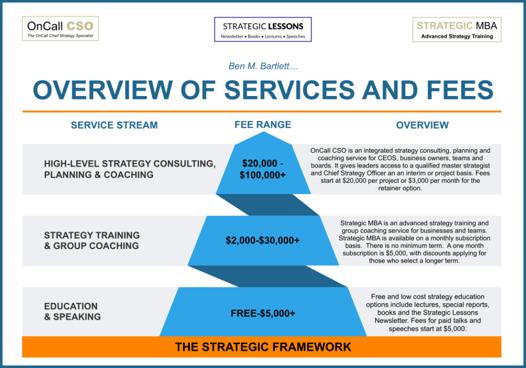 Our services start off with a range of free and low-priced education offerings.  Free options include the Strategic Lessons newsletter, free talks, speeches and lectures, strategy briefings, and free guides, reports and book previews.